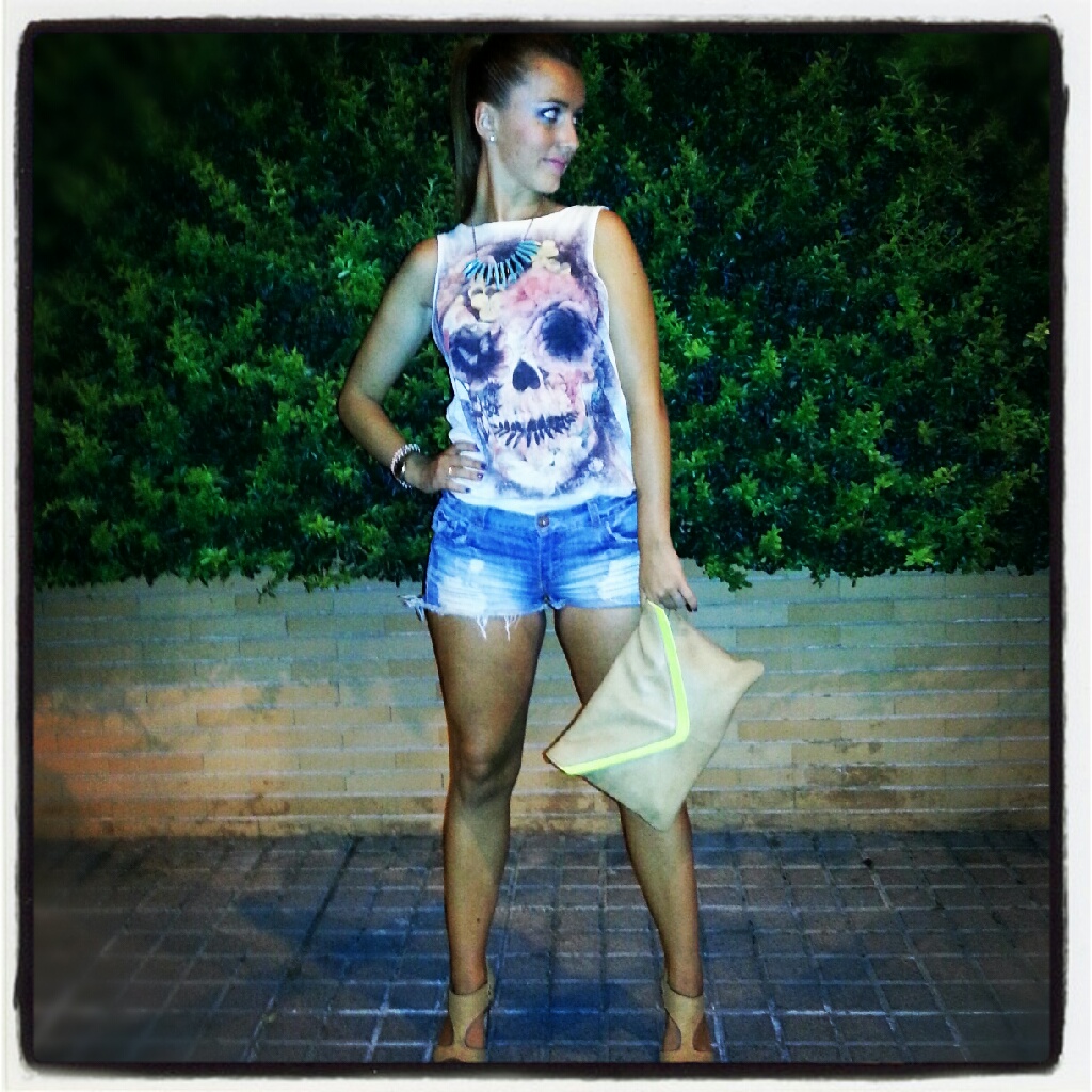 Estás preciosa en el look!!.. a mí me encantan los shorts vaqueros, y el clutch y camiseta son ideales!!!..