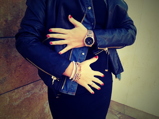 En este caso tenía gana de dejar  colgando en mi armario el abrigo,  para llevar mi chupa de cuero, dándole un punto rocker a un vestido básico negro y de líneas muy femeninas.